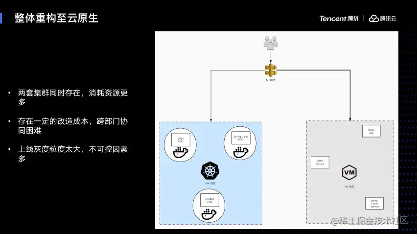 单体应用改造成微服务应用成本高,服务发现机制与案例都需要更改到符合云原生的标准。不仅仅是PaaS平台,它的改造比较小,只是需要换一个新的集群,但是业务的服务改造成本比较大。不仅需要改自己的服务,还需要上下游去适配,同时出现的跨部门协同会造成非常大的沟通和协作成本。而我们上线的力度较大,只需要把一个闭环的业务进行上线,会导致很多不可控的因素。