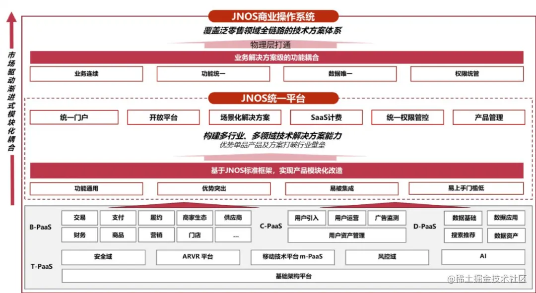 为精确解决上述问题,保障各个商业产品快速接入零售云,JNOS提供了一系列快速响应市场变化的落地方案、方法论和标准,通过打造B-PaaS、C-PaaS、D-PaaS、T-PaaS以及JNOS统一平台的通用化能力, 将京东零售成熟的泛零售行业解决方案与方法论对外输出,实现技术实施、运营流程以及业务活动的全面标准化。