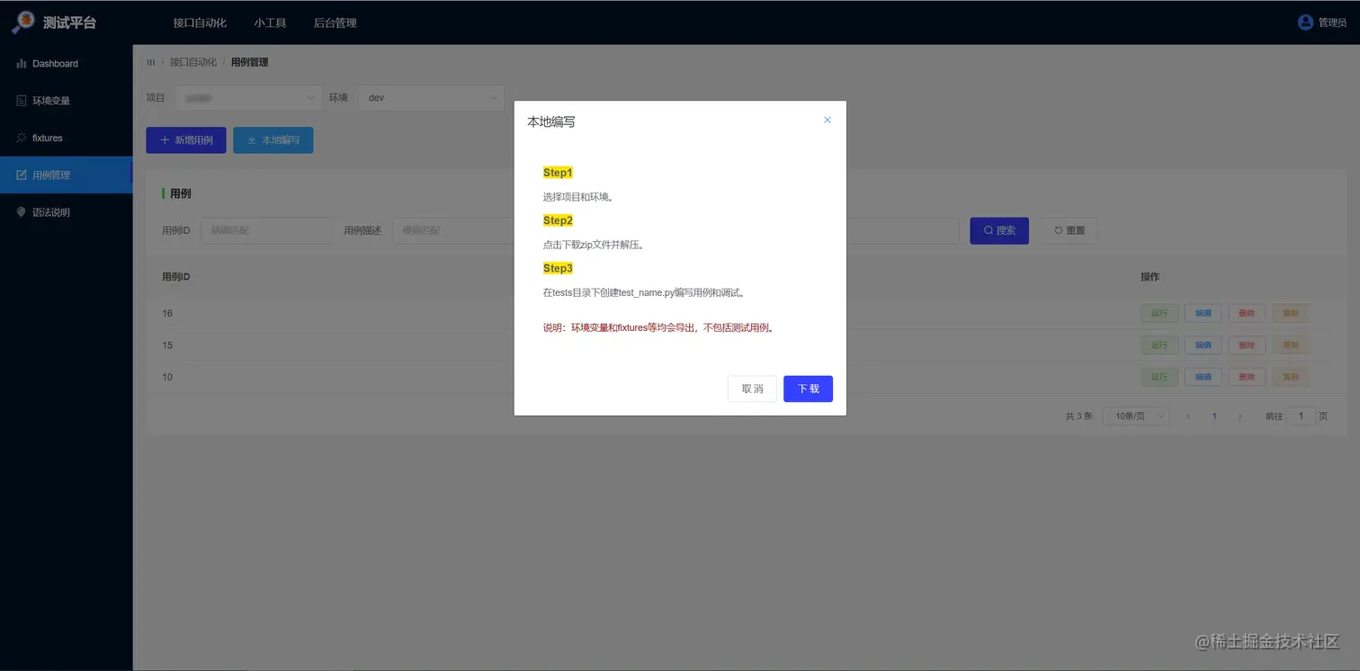PyCharm写代码体验更好,正确姿势是从平台下载包含环境变量和fixtures等项目结构代码,本地编写用例,调试,跑通后,粘贴到平台上共享和维护: