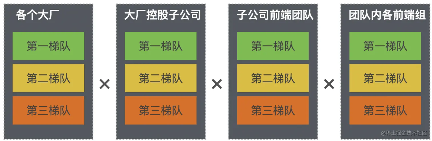 结论:大厂分一二三梯队(小厂也同理),在大厂控股的所有子公司里面,也分一二三梯队,在某个公司里面的多个部门的前端团队,也分一二三梯队,在一个前端团队内部划分的几个组里面,也分一二三梯队,梯队越靠前,进入难度越高。