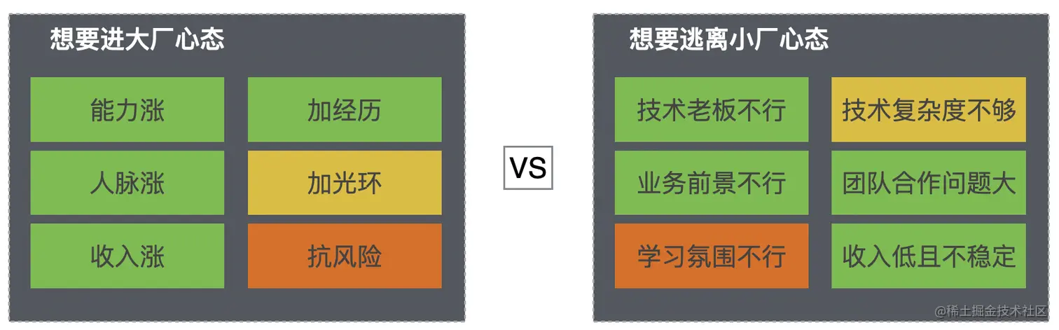 结论:在既想逃离和又想进之间,需要先把想进想清楚,急躁毛糙的逃离心态,对进大厂没有实质帮助,甚至带来负面影响。