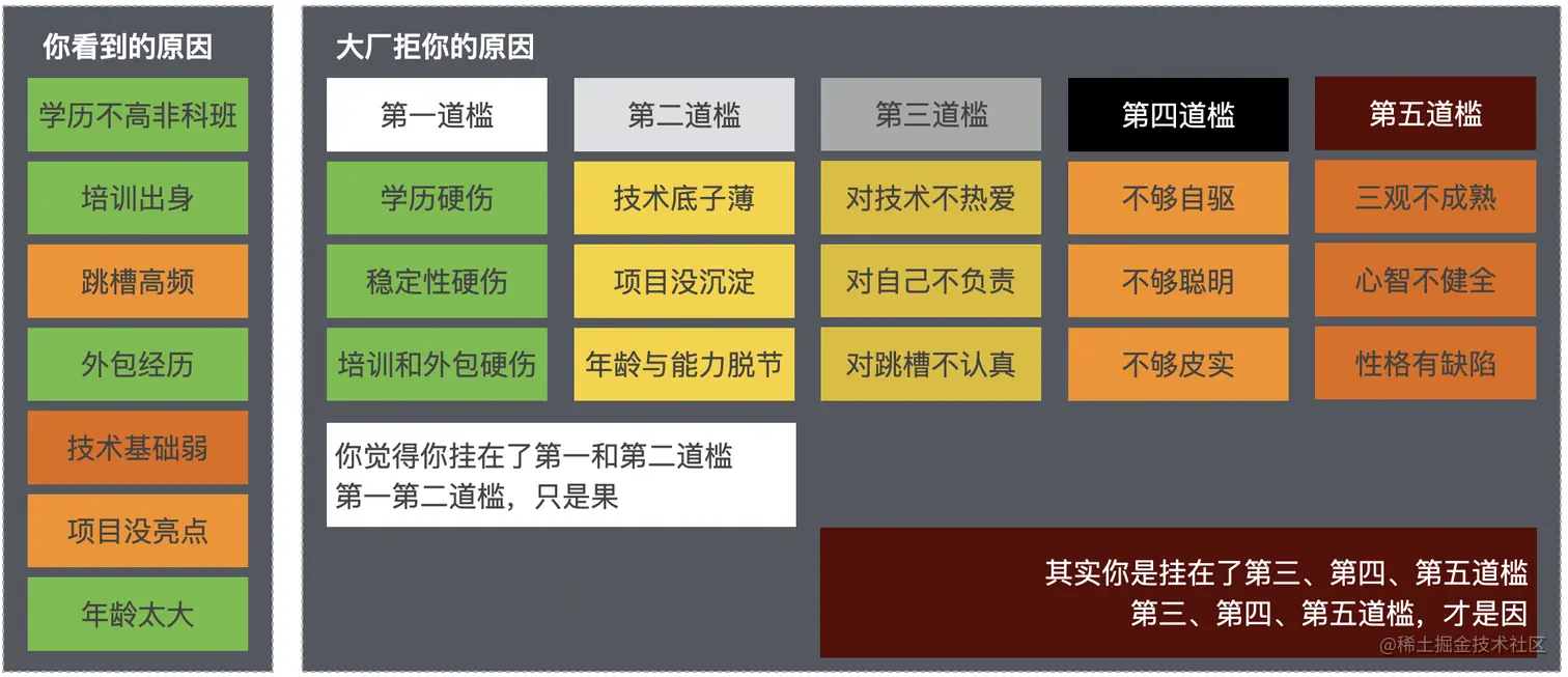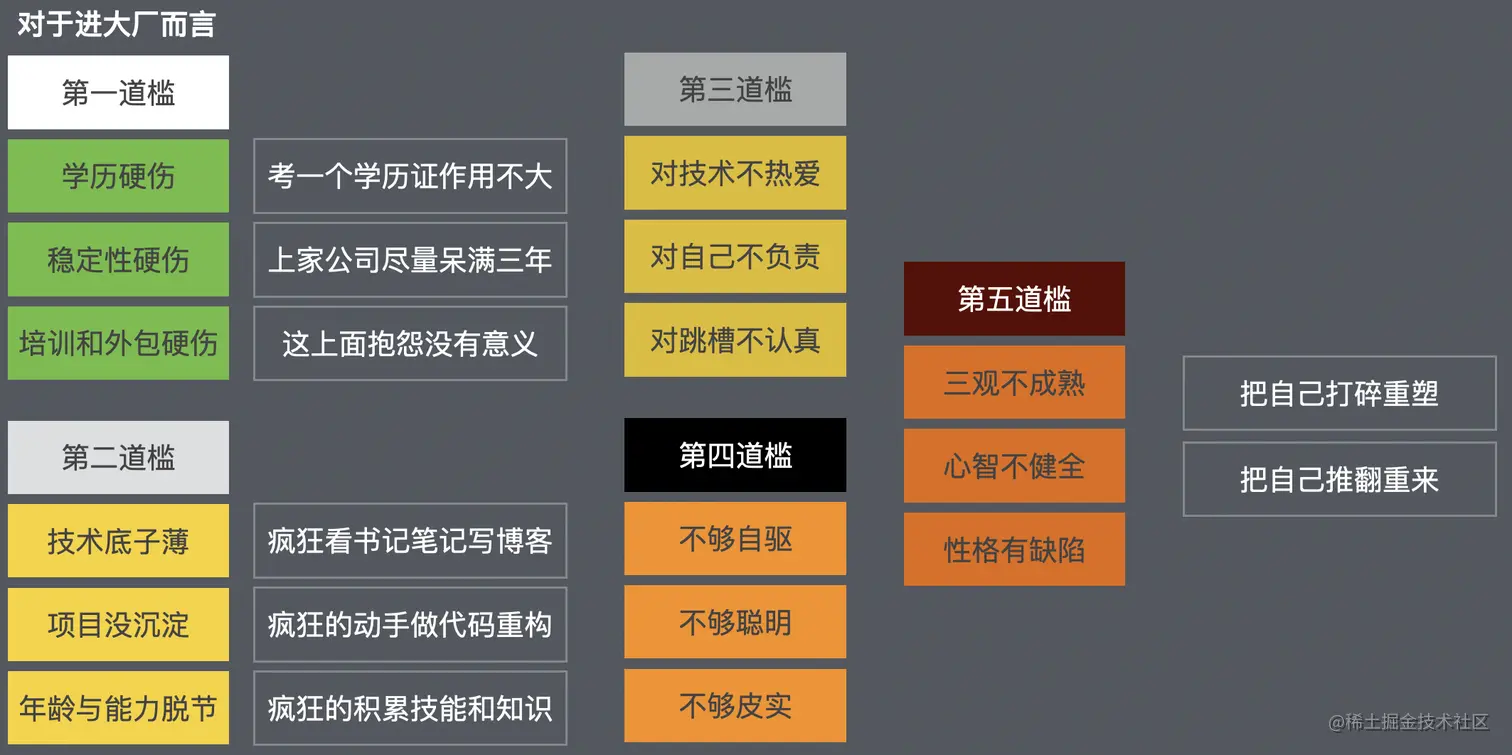 结论:你跟大厂的距离不仅仅是学历跳槽等等这些背景,也不仅仅是技术积累项目经验这些能力,也不仅仅是三观人品这些人格特征,从技术到认知格局再到行动力,你跟大厂之间有全方位的差距,每一个都很重要。