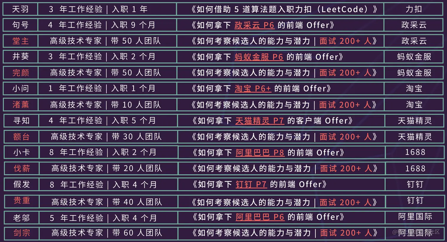 针对第二个问题,拿上面大会收门票来举例,如果你无法认同,造成了立场先行,在没有深入研究前(甚至根本就没有耐心去研究)而直接就抵触它,很可能你还不是一个成熟的人,或者说是缺乏理性思考的人,那么你无法进大厂的问题就出在了第五道槛这里,你可以再看下这一期的分享嘉宾和内容: