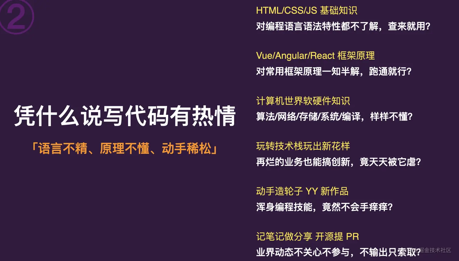 那么如何知道自己在第二三四五到槛上有问题呢,找一个工作有七八十来年的一个前端前辈,给自己简单沟通评测下就可以了,这些前端的前辈们阅人无数,是能诊断出你身上的问题是出在了哪里分别是哪几层,而把这几层抽象到顶点,往往就是你的性格原因,导致你无法听取和接受别人的建议,以及无法接纳和正视自己的问题,自然也就无法有效的进行改善,就算方法放到你面前(其实方法始终都在)也无法执行到底。