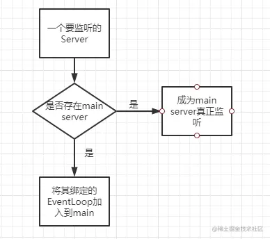 然后还有个一个常识,无法重复监听同一个端口,实际上Vertx对其的处理是对于重复监听同一个端口的采取轮询的策略,即Netty默认的策略,其实现也很简单。先引入一个概念:main server,就是第一个监听的TCPServerBase类,其余的监听的线程只要加入其ChildEventLoopGroup就可以了
