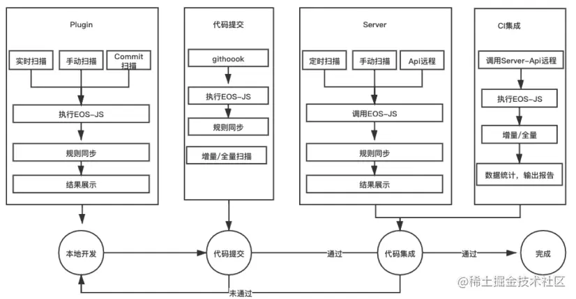 EOS-JS是一个扫描引擎,通过基础检测能力和模式约束,推动代码检测流程的运转。原始代码经过解析器的解析,在管道中逐一经过所有规则的检查,最终检测出所有不符合规范的代码,并输出为报告。