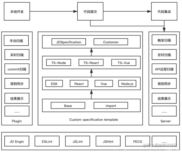 TS层: 这一层提供对TypeScript 的支持。扩展(自定义)层:针对团队的特殊规则诉求,提供定制化支持,目前已存在的JDSpecification便是为公司内部定制的前端代码扫描规范。