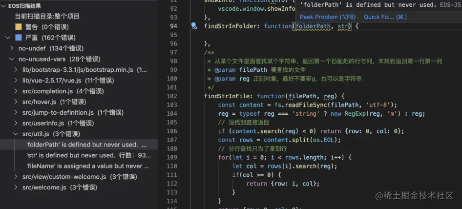本地开发实时检查: 本地编码过程中,EOS-VSCode插件有两种检查方式可供选择。实时检查编码问题给出修改建议,也可以针对单个文件、单个文件夹或者整个项目手动触发,开启检查流程,并将结果展示到前台。其优点在于实时性,可在编码过程中发现并解决编码规范及质量问题。