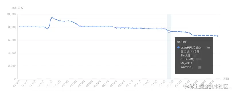 - 平台端:个人、团队、工程等各维度进行数据汇总,通过图形、报表多种类型进行数据展示及邮件通知。某团队编码问题变化趋势: