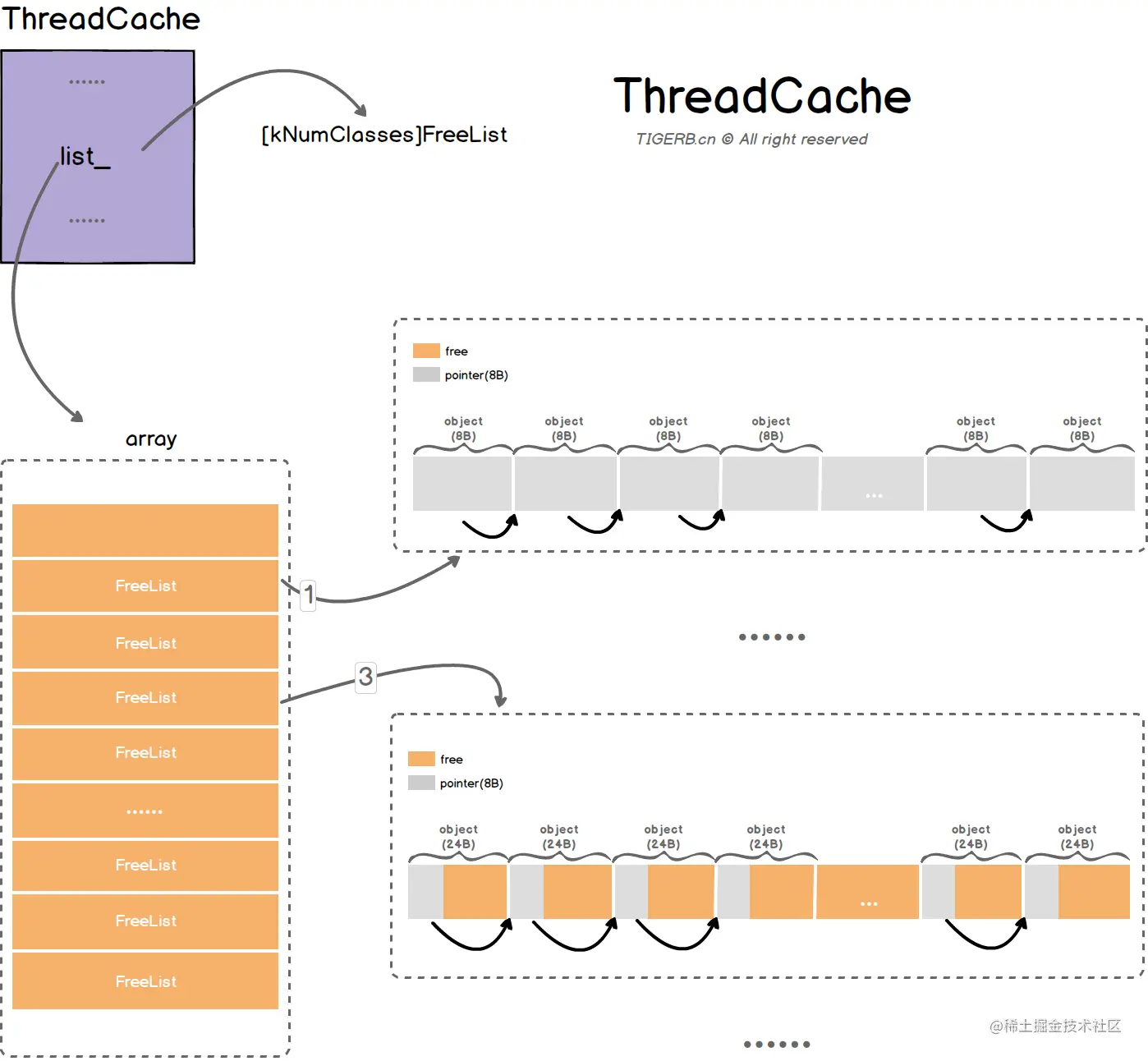 free_索引值为MaxNumber对应的FreeList,该FreeList的Object大小为MaxNumber Bytes; - MaxNumber的值由