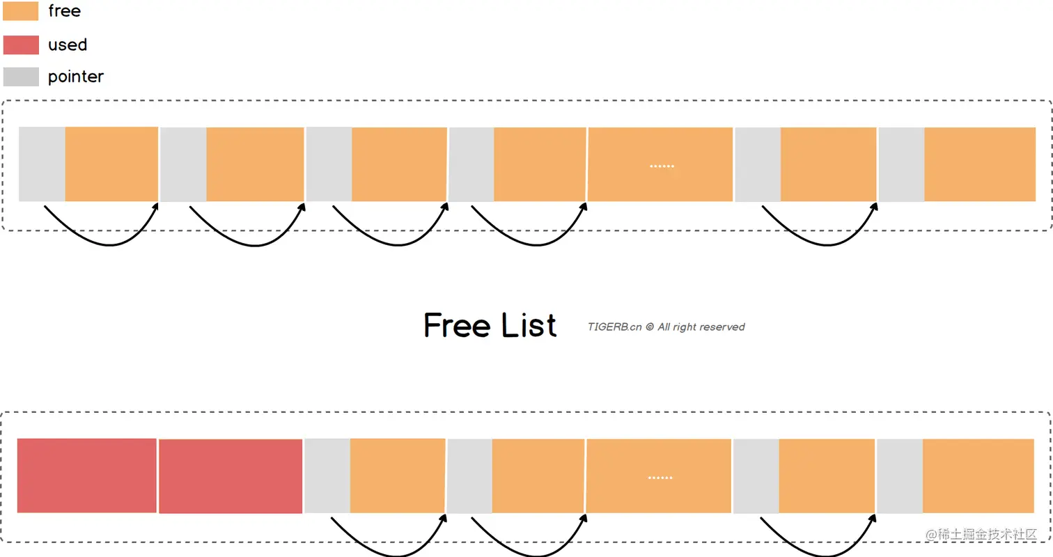 线性分配有个问题:“已经分配的内存被释放了,我们如何再次分配?”。大家会想到用链表LinkedList,是的没错,但是内存管理中一般使用的是FreeList。