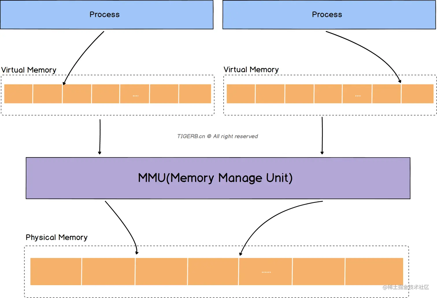 - 虚拟内存和物理内存是通过MMU(Memory Manage Unit)映射的(感兴趣的可以研究下)