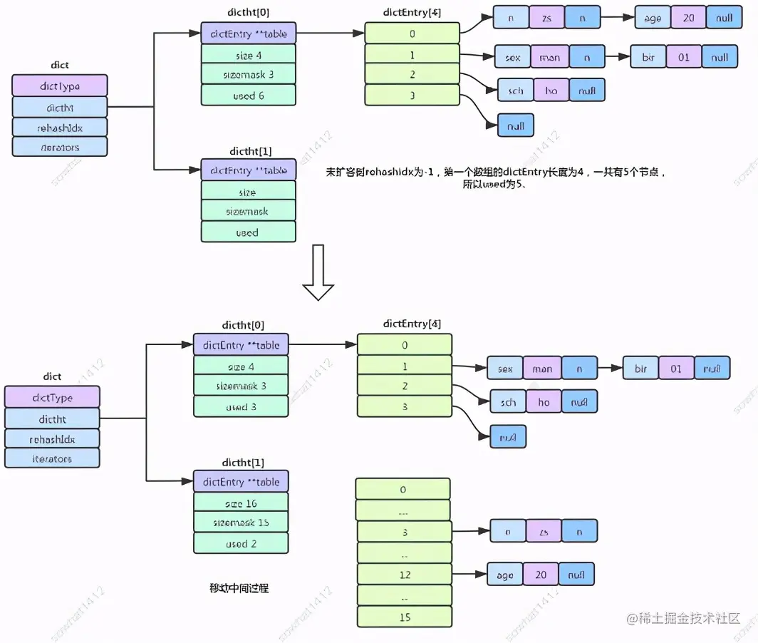 扩容之后的数组大小为大于used*2的2的n次方的最小值,跟 HashMap类似。然后挨个遍历数组同时调整rehashidx的值,对每个dictEntry[i] 再挨个遍历链表将数据 Hash 后重新映射到 dictht[1]里面。并且 dictht[0].use 跟 dictht[1].use 是动态变化的。