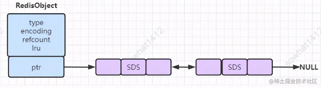 当你执行set name sowhat的时候,其实Redis会创建两个RedisObject对象,建的RedisObject 和 值得RedisOjbect 其中它们type = REDIS_STRING,而SDS分别存储的就是 name 跟 sowhat 字符串咯。
