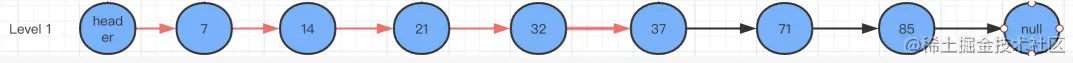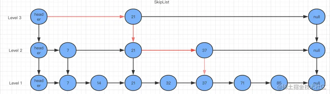 跳表包含一个表头,它查找数据时,是从上往下,从左往右进行查找。现在找出值为37的节点为例,来对比说明跳表和普遍的链表。