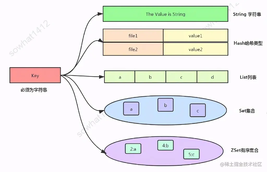 这里需要明确一点:Redis中只有一个K,一个V。其中 K 绝对是字符串对象,而 V 可以是String、List、Hash、Set、ZSet任意一种。