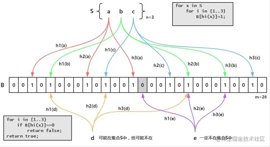 当一个元素被加入集合时,通过K个散列函数将这个元素映射成一个位数组中的K个点(有效降低冲突概率),把它们置为1。检索时,我们只要看看这些点是不是都是1就知道集合中有没有它了:如果这些点有任何一个为0,则被检元素一定不在;如果都是1,则被检元素很可能在。这就是布隆过滤器的基本思想。