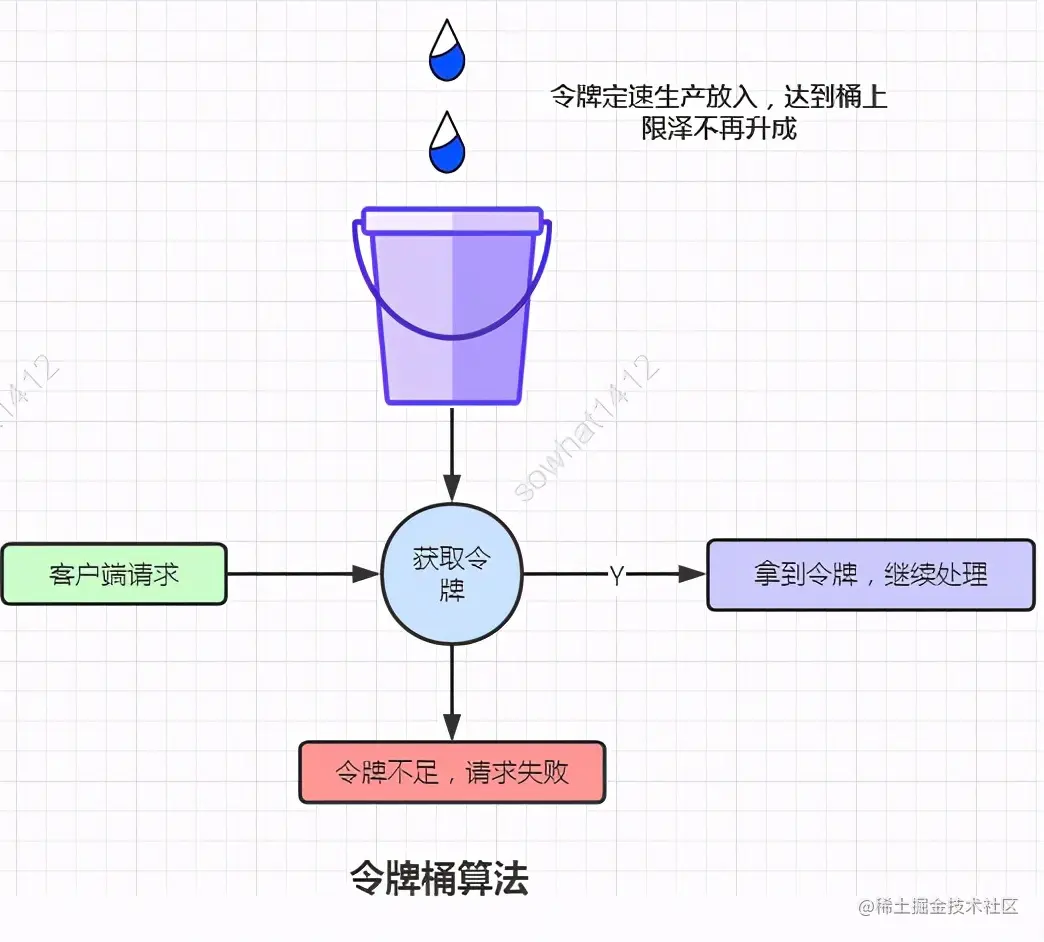 漏桶算法思路:把水比作是请求,漏桶比作是系统处理能力极限,水先进入到漏桶里,漏桶里的水按一定速率流出,当流出的速率小于流入的速率时,由于漏桶容量有限,后续进入的水直接溢出(拒绝请求),以此实现限流。