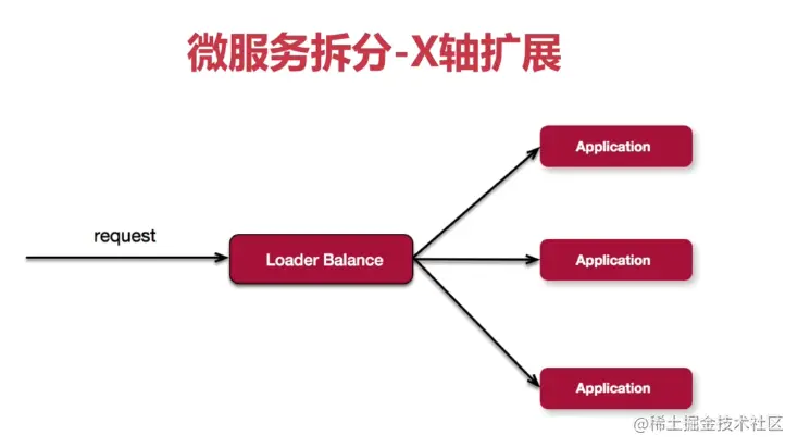 - X 轴:从单体系统或服务,水平克隆出许多系统,通过负载均衡平均分配请求;