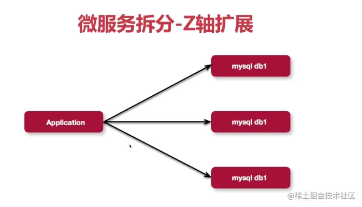 - Z 轴 :面向查找分割,基于用户、请求或者数据分割,例如可以将不同产品的 SKU 分到不同的搜索服务,可以将用户哈希到不同的服务等。