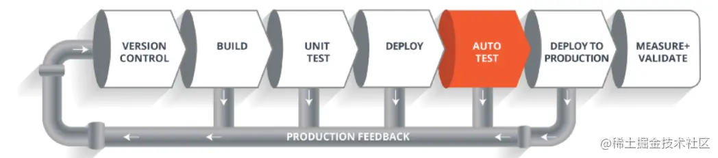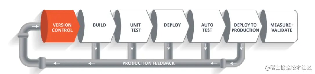 该流水线展示了一个软件在其最终交付给客户或者投入上线之前,它在其生命周期内各个阶段中的移动过程。 其实就是版本控制 -> 构建 -> 测试 -> 部署 -> 自动化测试 -> 部署上线 -> 验证测试的这样的一个流程。假设我们要构建一款 Web 应用程序,并将它部署在一个现场 Web 服务器上。假设现在开发团队已经将代码提交到版本控制系统中了(假设版本控制工具为 Git)。