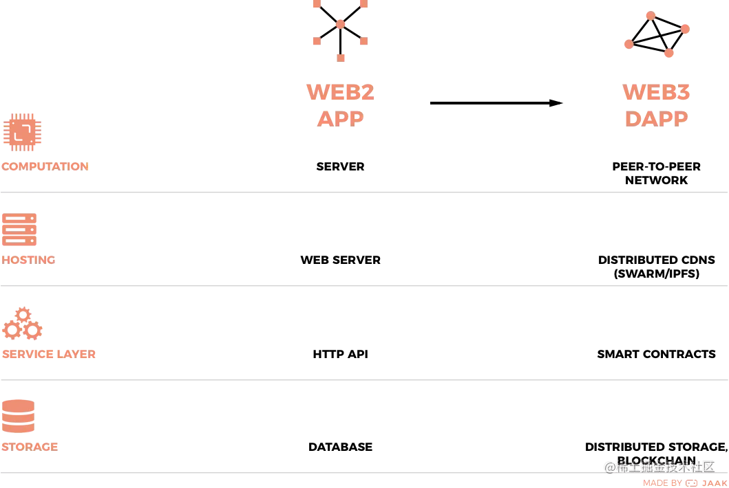 Dapp就是分布式app。对我们这样上了年纪的开发者会比较难理解:没有服务器。然而,“后端”代码运行在一个分布式的端到端的节点网络上,前端代码则由分布式的CDN提供。