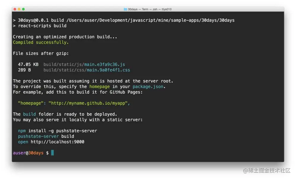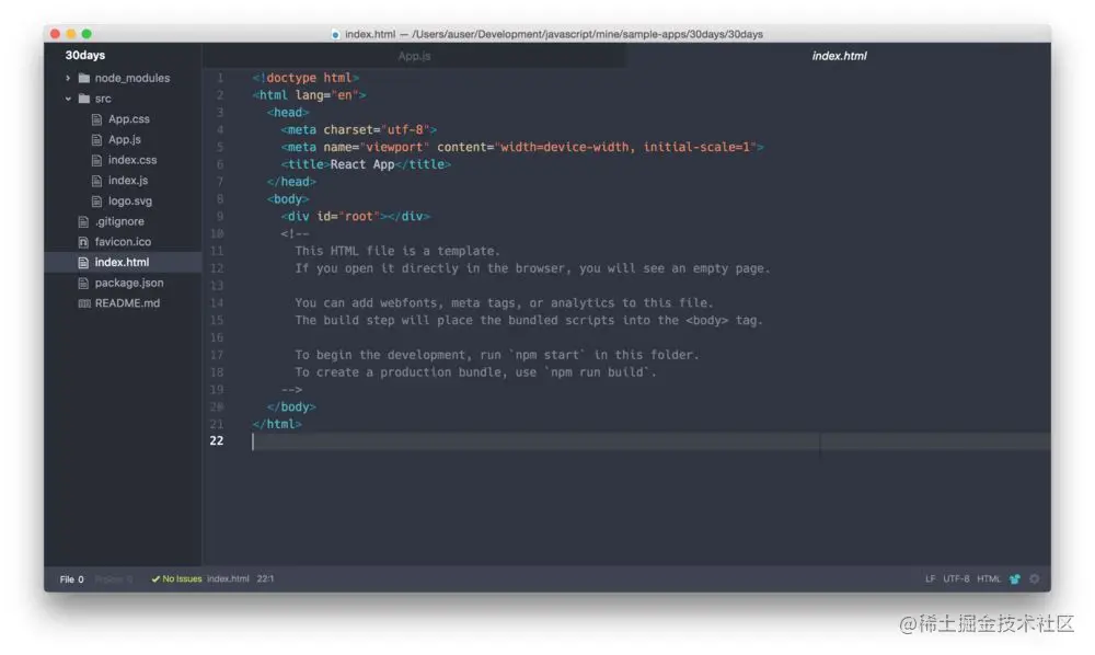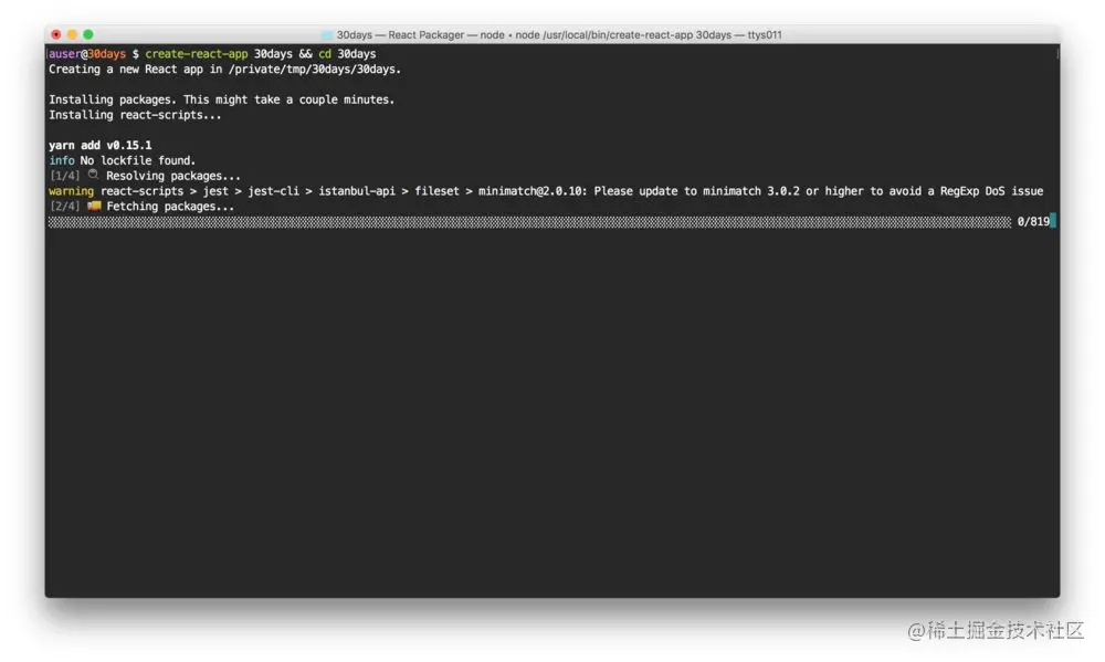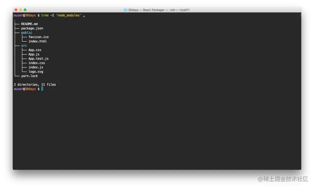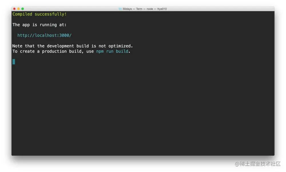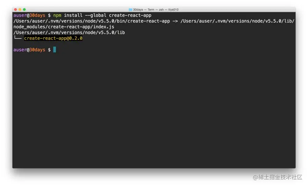 我们创建一个我们称之为30days的新应用,使用我们刚刚安装的 create-react-app 命令。 在要创建应用的目录中打开终端窗口。