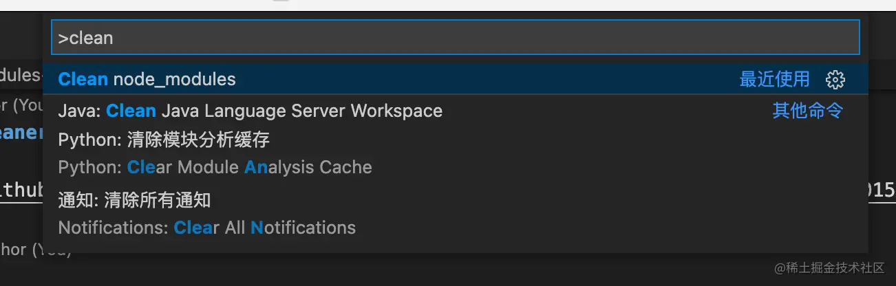 这里推荐一款vscode插件,node-modules-cleaner,可以在商店直接搜索到,使用也很简单,一条vscode命令即可。