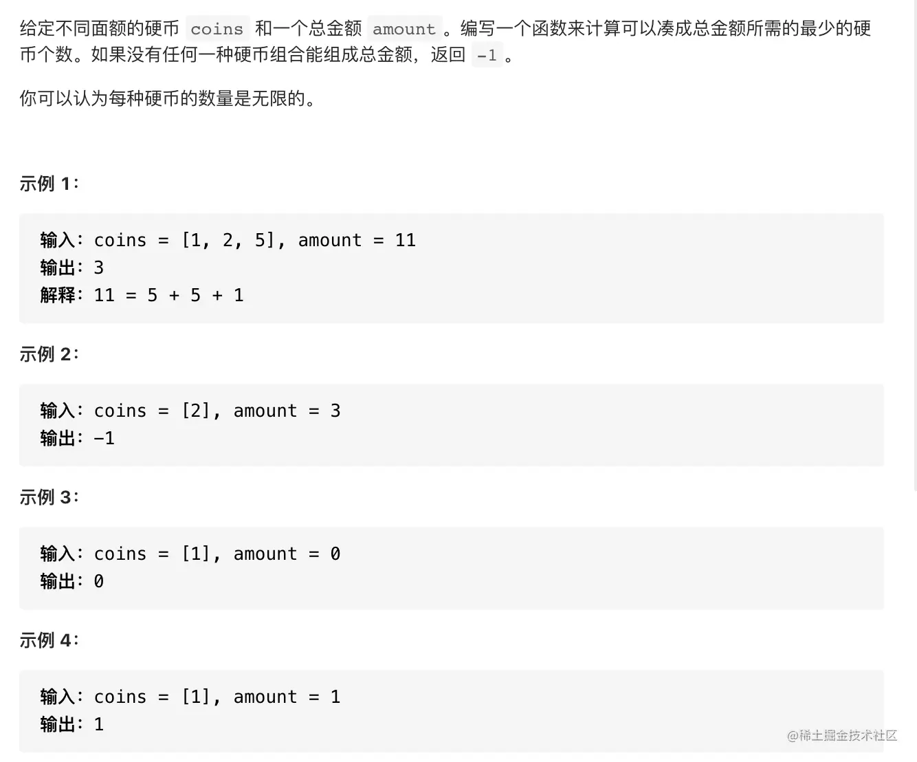 目标金额i只能由某个金额j, 再选择一枚硬币后得到, 因此枚举所有的j, 找出最小的dp[j], dp[i] = min_dp[j] + 1; 注意dp[j]可能为-1的情况