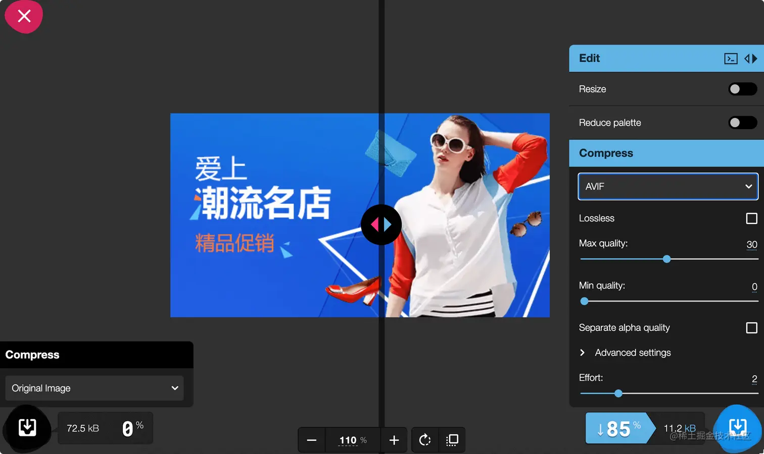 可以使用 Squoosh 这个在线的图像压缩应用程序,可以在多种格式的图像之间互相转换,更厉害的是它提供了各种高级的图像压缩选项让你选择。