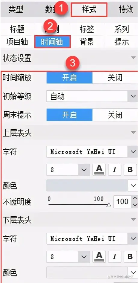 3)选择样式>时间轴,时间缩放、周末提示选择开启,如下图所示: