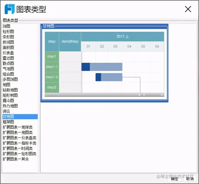 打开finereport设计器,以单元格元素或者悬浮元素插入图表,在图表类型中选择甘特图,如下图所示: