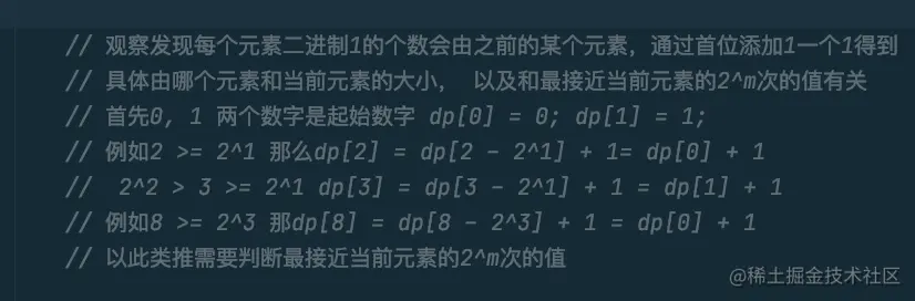 // 例如8 >= 2^3 那dp[8] = dp[8 - 2^3] + 1 = dp[0] + 1