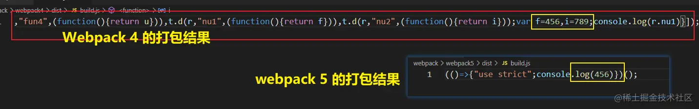 相同的代码,在webpack 4 的打包结果中,我们能看到不仅代码量大,而且还有 i=789 这个多余的代码,反观 webpack 5 的打包结果,简洁到难以置信;