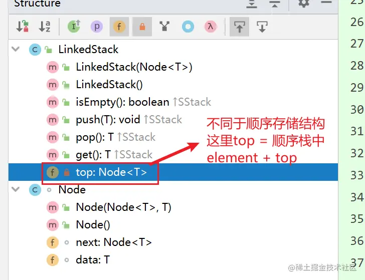 * 元素入栈:构建新节点,其next指向原top对象,后将top指向新节点对象