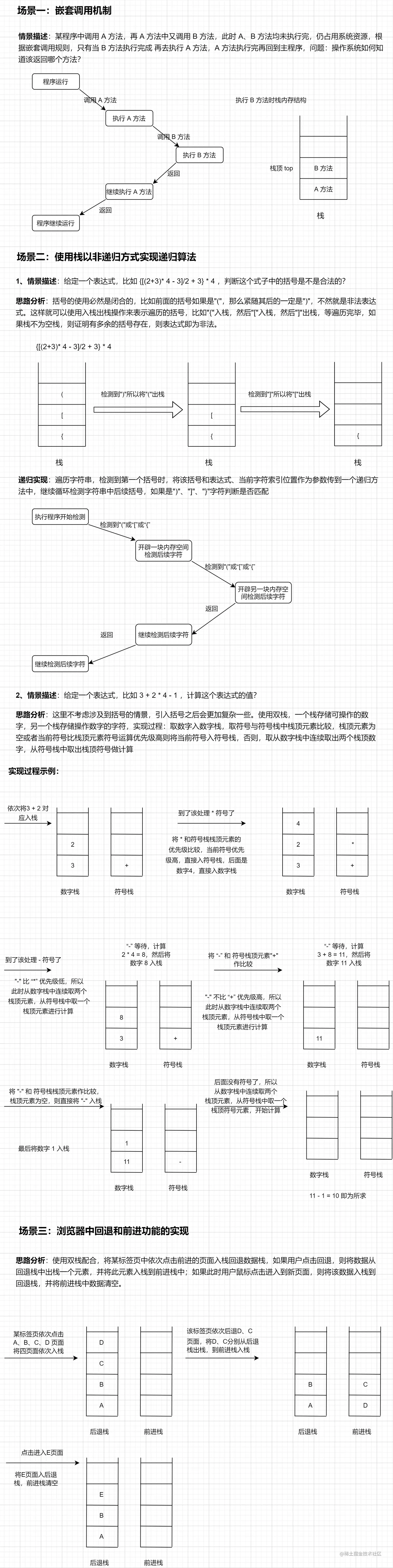 - 每种数据结构都是对一类高度相似的现实场景的抽象表述。随着对数据结构理解的深入,越来越理解这句话,栈也是这样,再想想浏览器的前进回退功能、检测表达式中总是应该成对存在的括号是否合法等这些场景,不用栈是不是就很麻烦?!