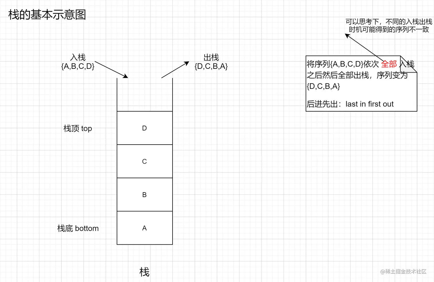 - 栈中插入元素的操作叫做入栈(push),删除元素的操作叫做出栈(pop)。