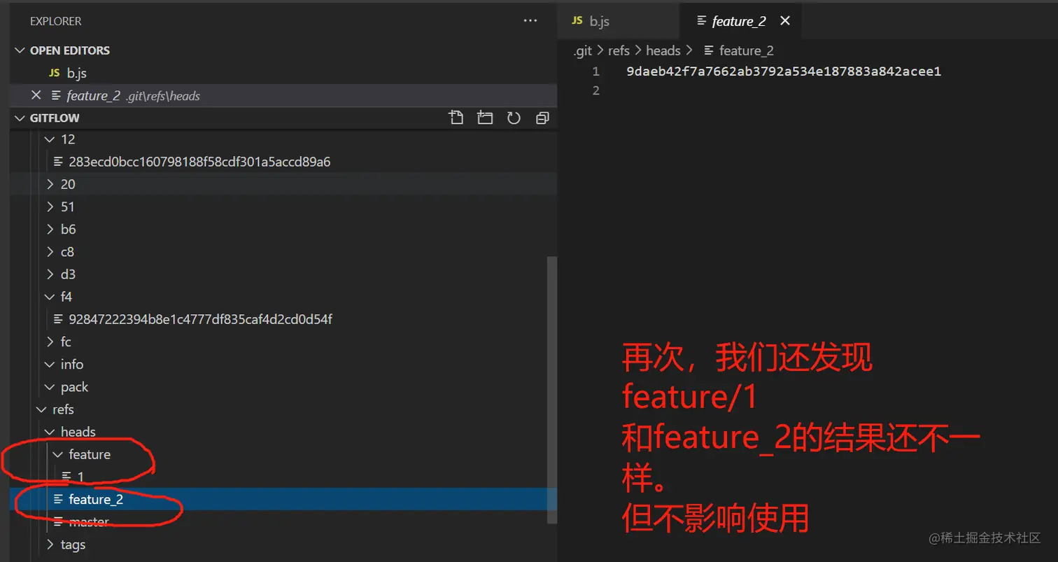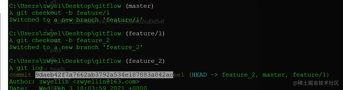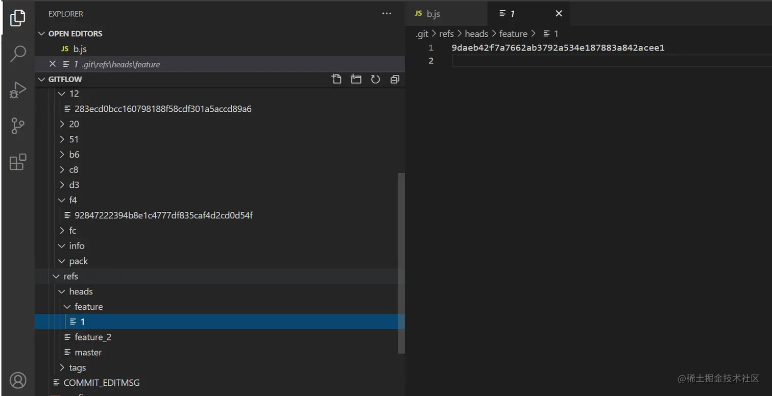 // 2、到.git\refs\heads\feature1 直接查看内容,发现是从切出位置的提交commmit对应hash值