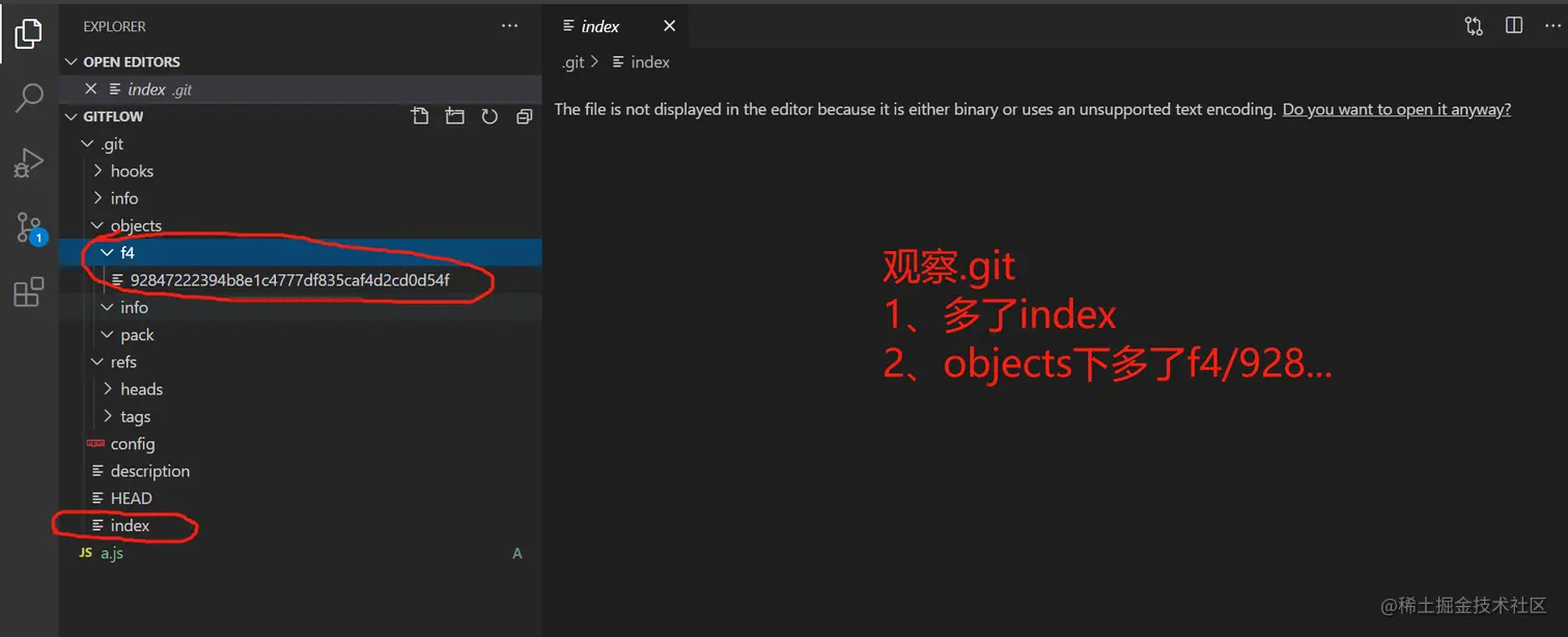 2、添加一些内容,如a.j中添加,然后git add . // 再查看.git里面的内容(发现多了Index及objects里面多了一个文件夹)