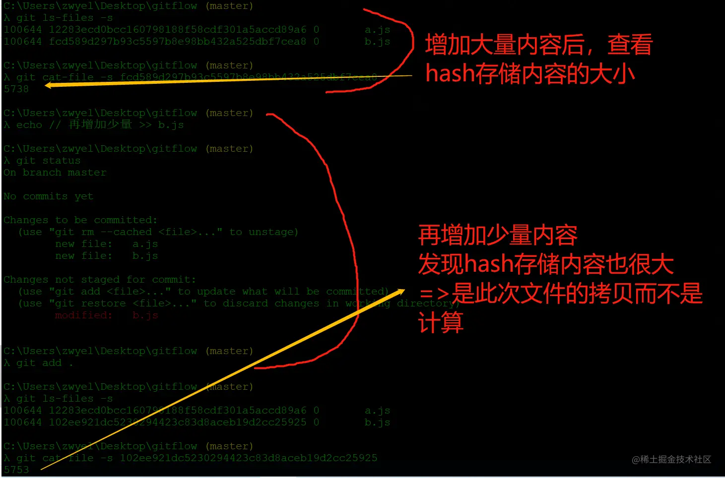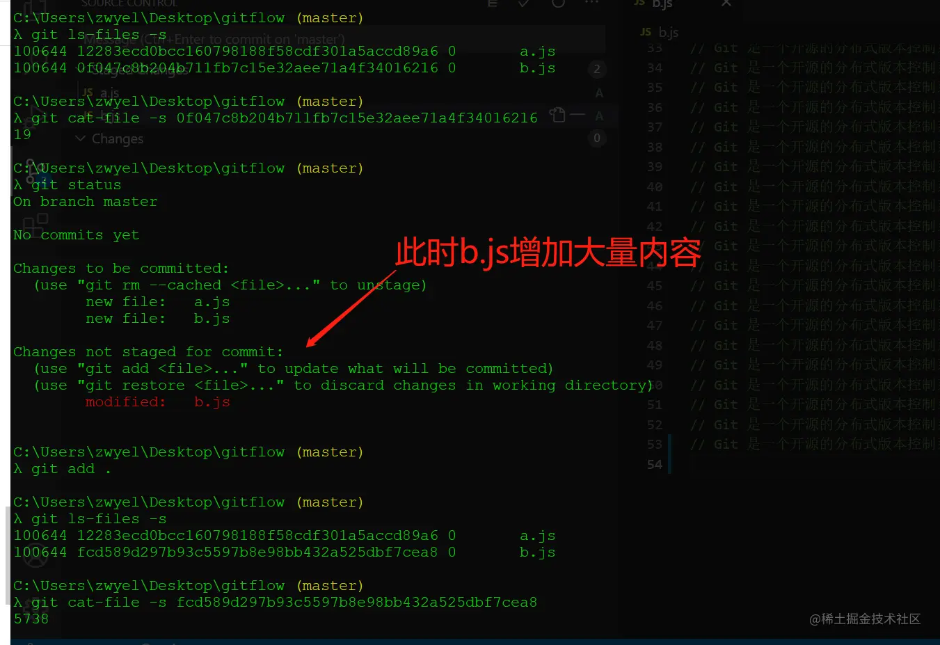 2、增加b.js及大量内容,然后git add . // 查看Index内容:git ls-files -s