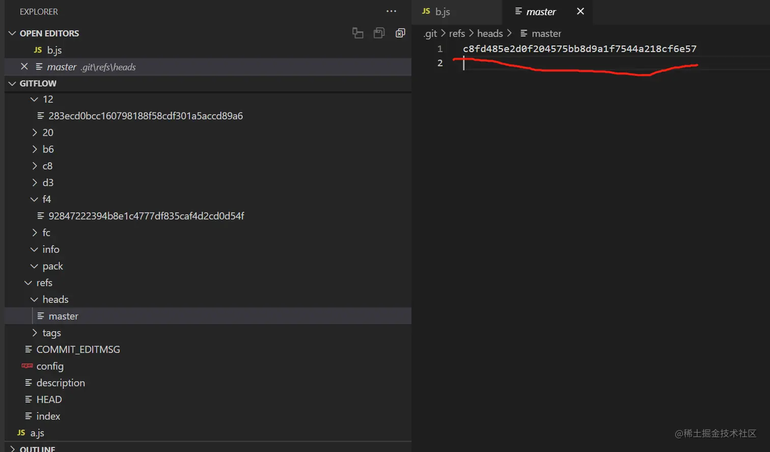 5、这个key存储在当前分支树那里,即当前为.git\refs\heads\master那里