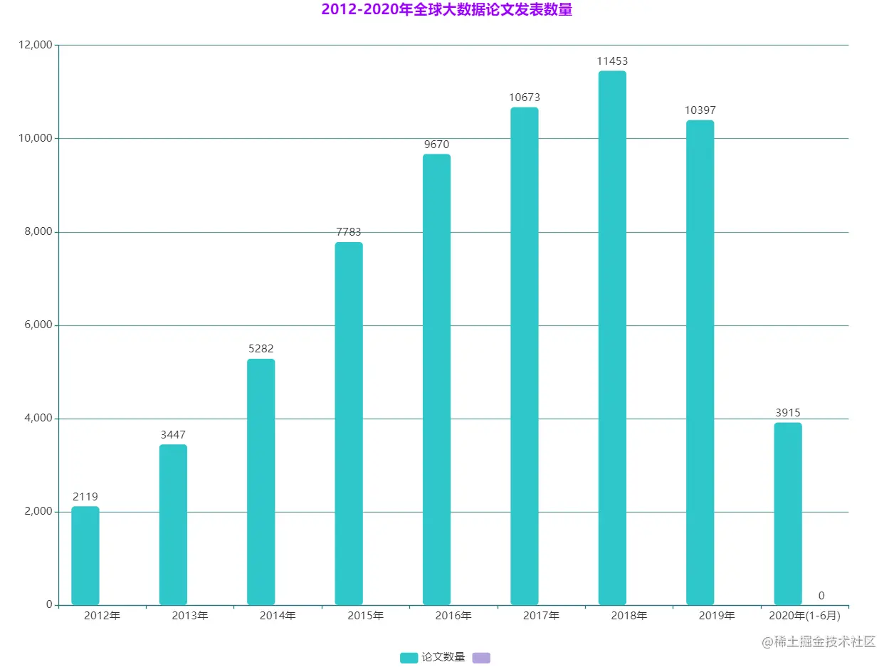 从上图可以看出,论文发表数量在2018年达到顶峰,是2012年的5.4倍,年增长率为 32.5%,随后2019年论文数量开始下降,2020年全年数量预计较去年还会近一步下滑,这也说明随着科学研究的不断进展,大数据的相关理论体系逐渐成熟,未来学术论文发表增长速度或将放缓。