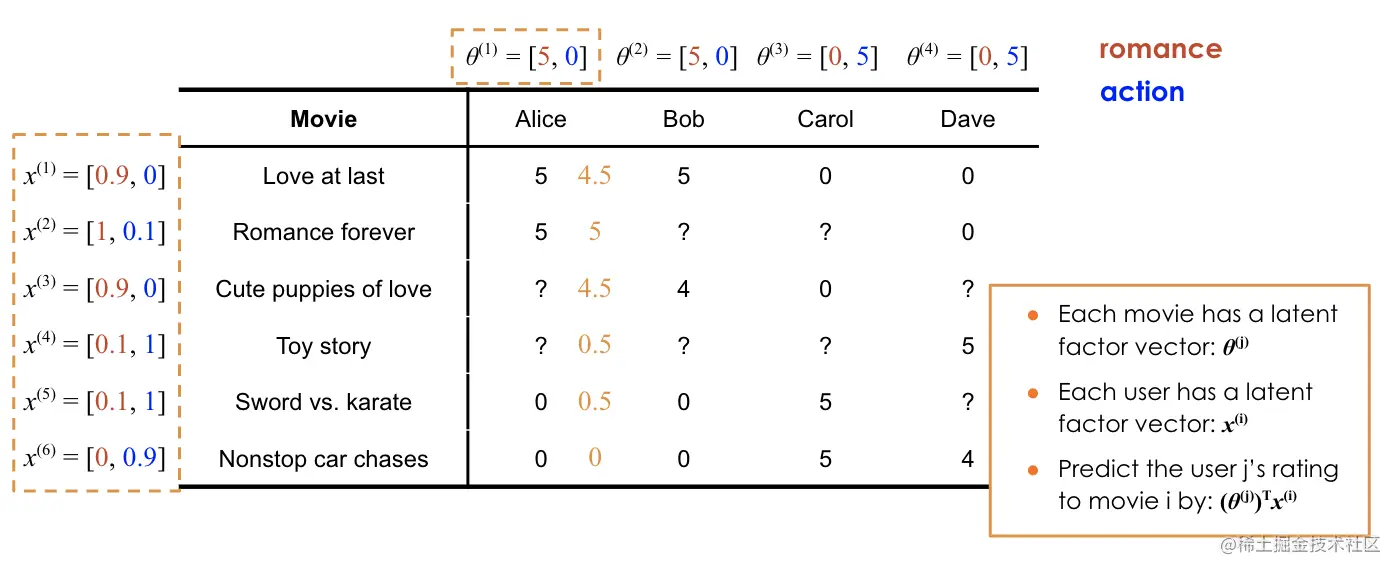 图 2 说明了因子分解方法的直观性。因子分解也被称为隐语义或者矩阵因子分解方法。目标是为每一个用户和电影都获取一个向量,该向量表示了它们的潜在特征。在这个例子中(图 2),向量的维数被指定为 2。电影向量 的两个元素代表该电影的浪漫程度和动作内容,用户向量 的两个元素分别表示用户对浪漫和动作内容的偏好程度。用户 对电影 的评分预测是 和 的点积,正如我们所期待的那样,这两个向量越对齐,代表着用户越喜欢这部电影。