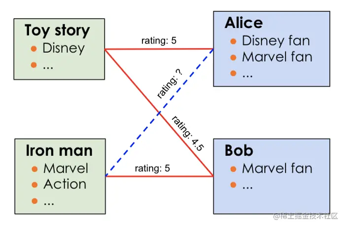 图 1(图片由作者提供)。这个示例数据集包括两个用户:爱丽丝和鲍勃,两部电影:玩具总动员和钢铁侠,还有三个评分记录(实线部分)。每个用户和电影都用它们的属性作为标签。