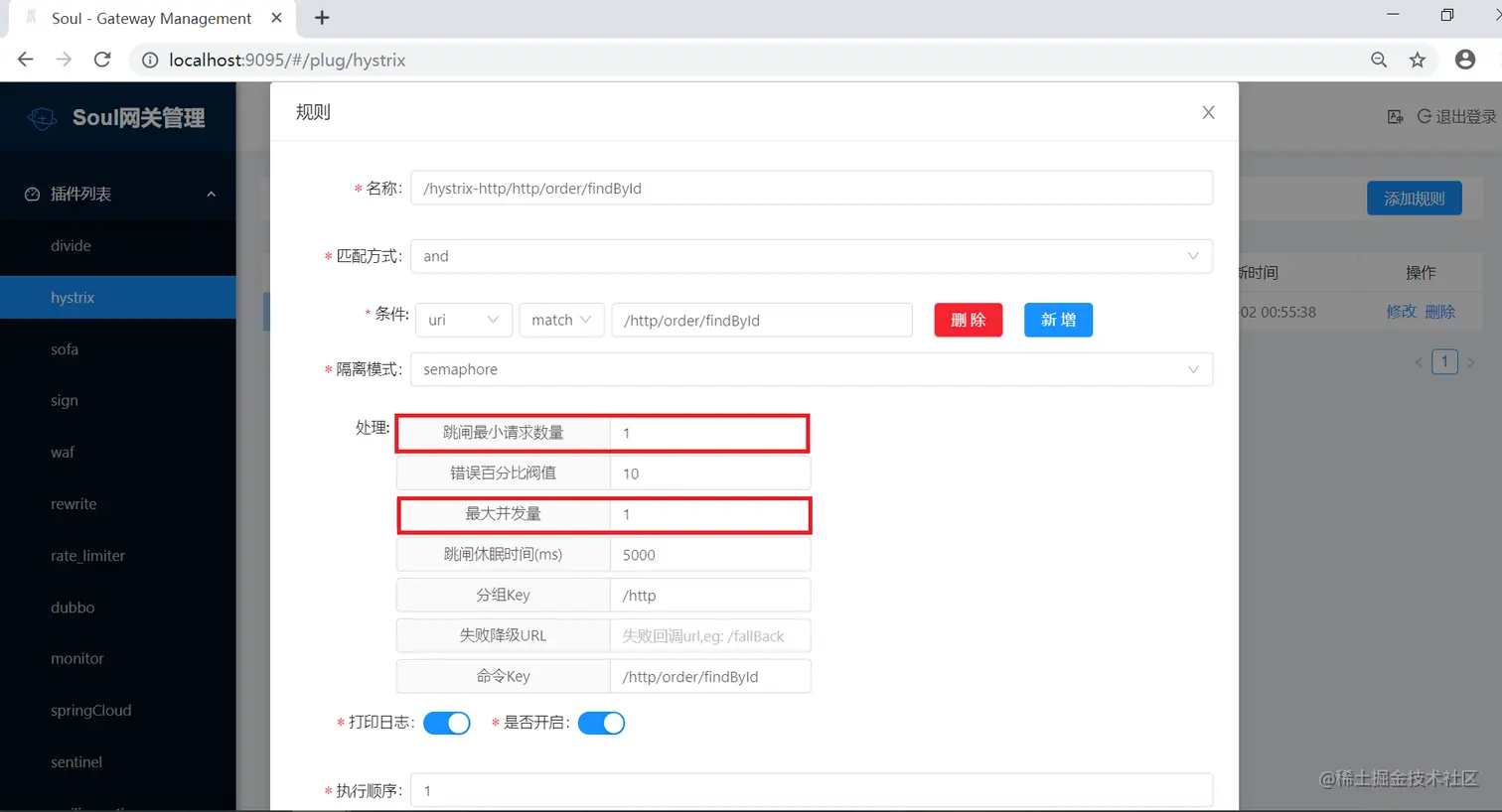 首先,修改一下soul-admin中Hystrix插件的配置,修改后的配置如下所示: