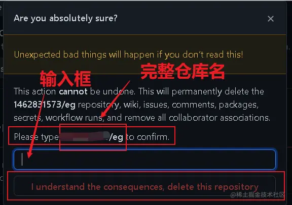 3 选中 Delete this repository 后,进入下个界面,在输入框中输入仓库的完整名称(此处输入具体仓库名称:xxxxxx/eg)然后点击最下面按钮 I understand the consequences,delete this repository : *(提醒一下,我就踩过这个坑:写具体仓库名称时,请注意是否有多余空格,如果有多余空格,请删除,否则无法点击最下面的按钮 I understand the consequences,delete this repository )
