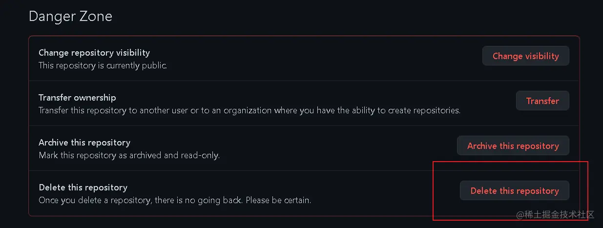 2 选中 Settings 后,进入下个界面,拉到最下面 Danger Zone 中,选中最下面的 Delete this repository: