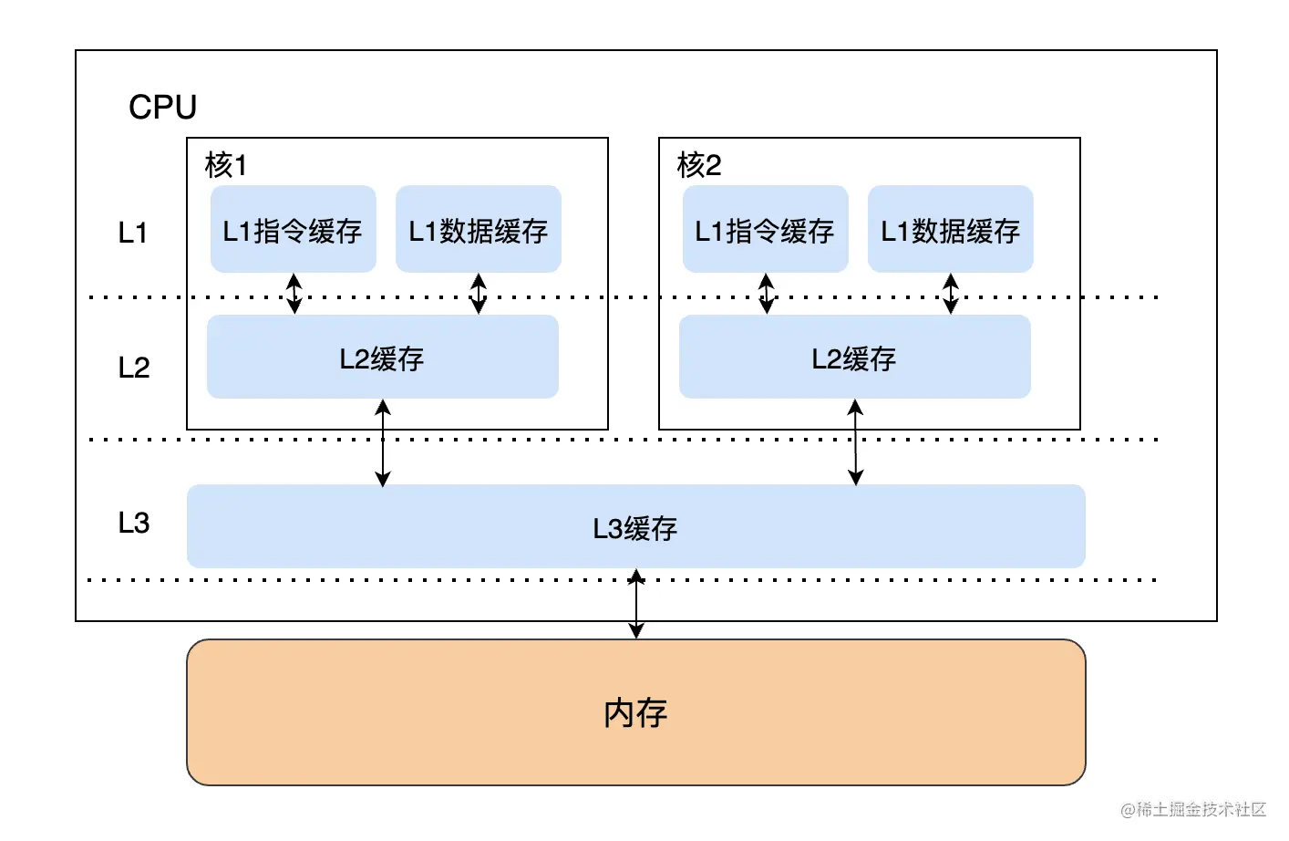 读写速度: L1(2-4CPU 周期) > L2 (10-20CPU 周期) > L3 (20-60CPU 周期)