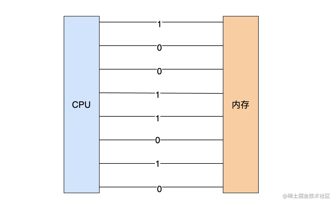 总线可以看成是多根导线的集合,通过控制导线电压的高低来传递数据,高电压是 1,低电压是 0。
