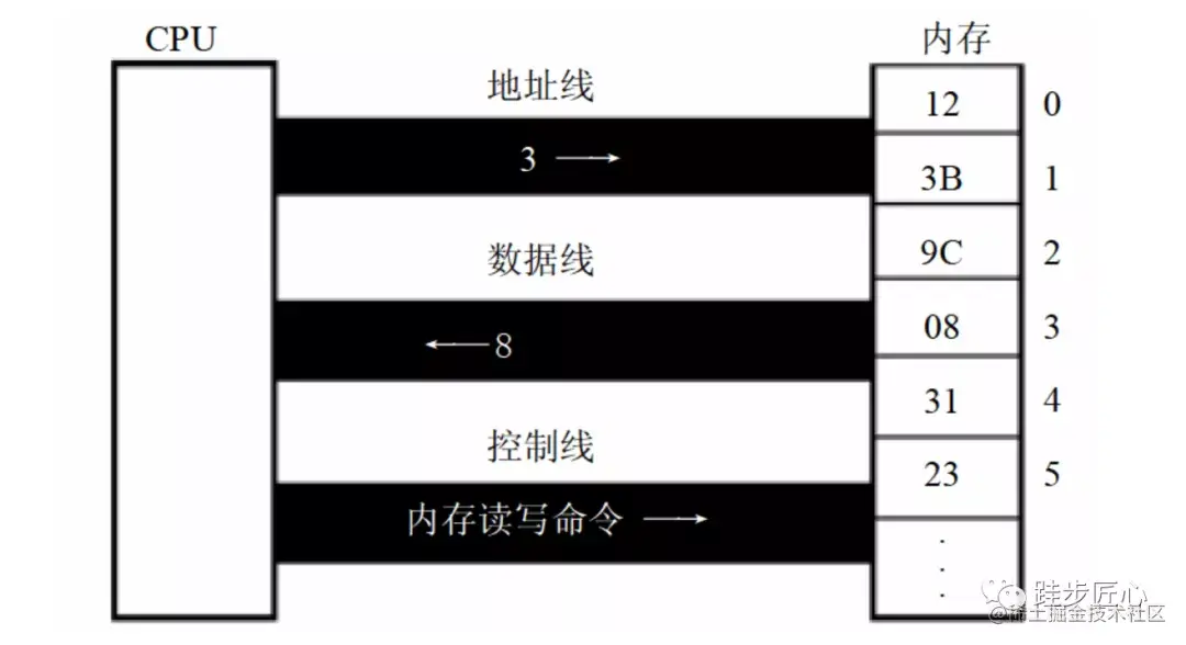 3 类总线分别负责对应信息的传输:CPU 通过地址总线将要操作的内存地址信息传递给内存;通过控制总线发出内存读命令;内存将数据从数据总线传入 CPU。